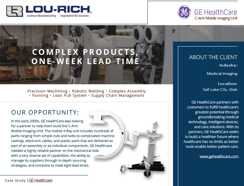 When precision, cleanliness, and performance are non-negotiable, Lou-Rich delivers. A standout example is our partnership with GE Healthcare, where we played a key role in assembling complex structures for their mobile X-ray systems. These high-performance medical devices required meticulous attention to detail, from clean assembly environments to tight quality control.