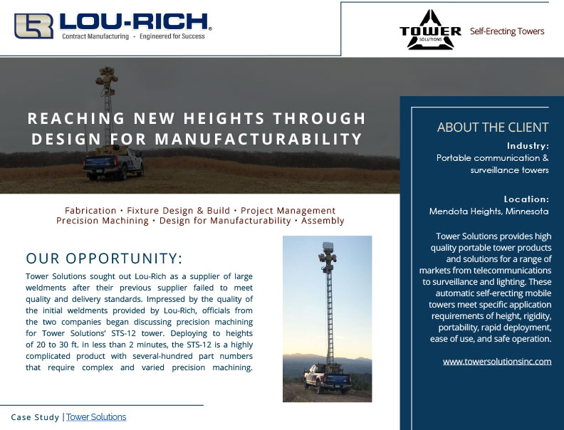 Complex manufacturing often starts with complex challenges. Our work with Tower Solutions is a powerful example of how Lou-Rich applies engineering expertise and DFM principles to build better, smarter, and stronger.