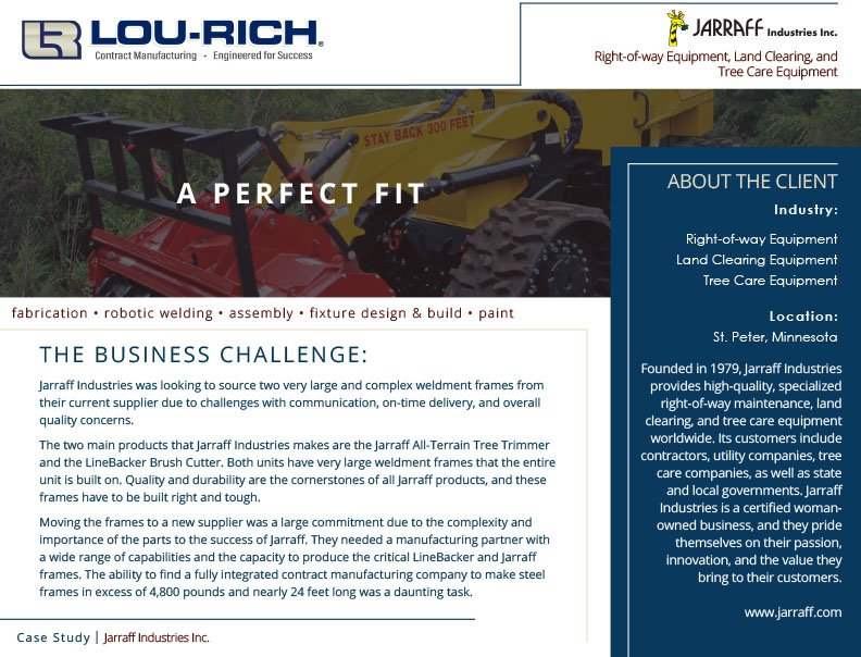 Manufacturers of industrial equipment need large weldments that are strong, precise, and built to last. At Lou-Rich, we specialize in fabricating and welding heavy-duty structures that withstand demanding environments. A prime example is our partnership with Jarraff Industries Inc., where we leveraged robotic welding technology and our expert fabrication team to deliver high-quality, repeatable large weldments for their land-clearing equipment.